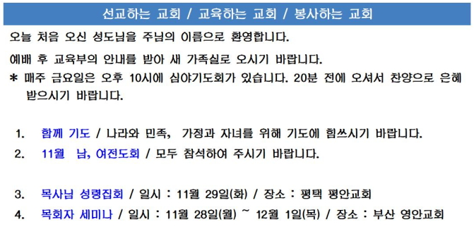 교회소식 (2022년 11월 27일 주일) 관리자 0 4035 2022.11.27 13:08 Author 1 1 Lv.77 관리자 최고관리자 368,380 (85.8%) 너희 안에 이 마음을 품으라 곧 그리스도 예수의 마음이니(빌립보서 2:5) Let this mind be in you, which was also in Christ Jesus(Philippians 2:5)