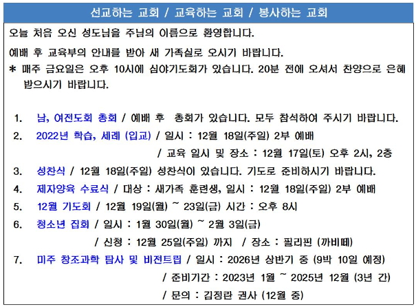교회소식 (2022년 12월 04일 주일) 병천교회 0 4353 2022.12.04 16:07 Author 1 0 Lv.1 병천교회 최고관리자 0 (0%) 너희도 그들 중에서 예수 그리스도의 것으로 부르심을 받은 자니라. And you also are among those who are called to belong to Jesus Christ. (롬 1:6 - Rm 1:6)