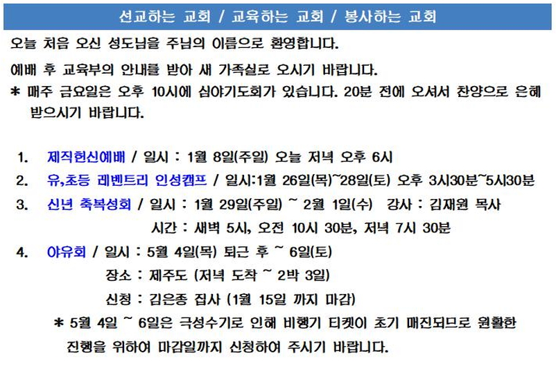 교회소식 (2023년 1월 8일 주일) 관리자 0 4407 2023.01.08 14:01 Author 1 1 Lv.77 관리자 최고관리자 368,380 (85.8%) 너희 안에 이 마음을 품으라 곧 그리스도 예수의 마음이니(빌립보서 2:5) Let this mind be in you, which was also in Christ Jesus(Philippians 2:5)