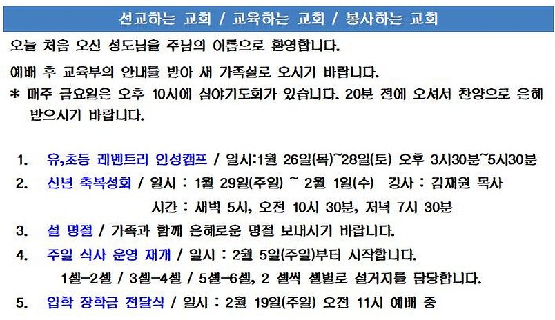 교회소식 (2023년 1월 22일 주일) 병천교회 0 4135 2023.01.22 14:36 Author 1 0 Lv.1 병천교회 최고관리자 0 (0%) 너희도 그들 중에서 예수 그리스도의 것으로 부르심을 받은 자니라. And you also are among those who are called to belong to Jesus Christ. (롬 1:6 - Rm 1:6)
