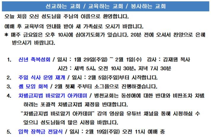 교회소식 (2023년 1월 29일 주일) 병천교회 0 4578 2023.01.29 16:21 Author 1 0 Lv.1 병천교회 최고관리자 0 (0%) 너희도 그들 중에서 예수 그리스도의 것으로 부르심을 받은 자니라. And you also are among those who are called to belong to Jesus Christ. (롬 1:6 - Rm 1:6)