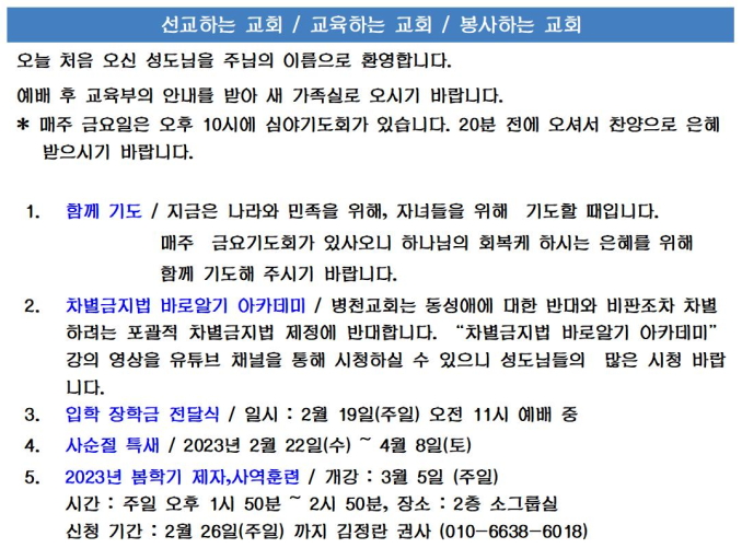 교회소식 (2023년 2월 12일 주일) 관리자 0 4445 2023.02.12 19:02 Author 1 1 Lv.77 관리자 최고관리자 368,630 (88.7%) 너희 안에 이 마음을 품으라 곧 그리스도 예수의 마음이니(빌립보서 2:5) Let this mind be in you, which was also in Christ Jesus(Philippians 2:5)
