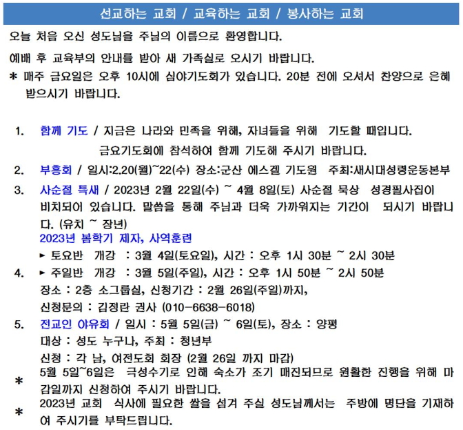 교회소식 (2023년 2월 19일 주일) 관리자 0 4302 2023.02.19 18:46 Author 1 1 Lv.77 관리자 최고관리자 368,380 (85.8%) 너희 안에 이 마음을 품으라 곧 그리스도 예수의 마음이니(빌립보서 2:5) Let this mind be in you, which was also in Christ Jesus(Philippians 2:5)