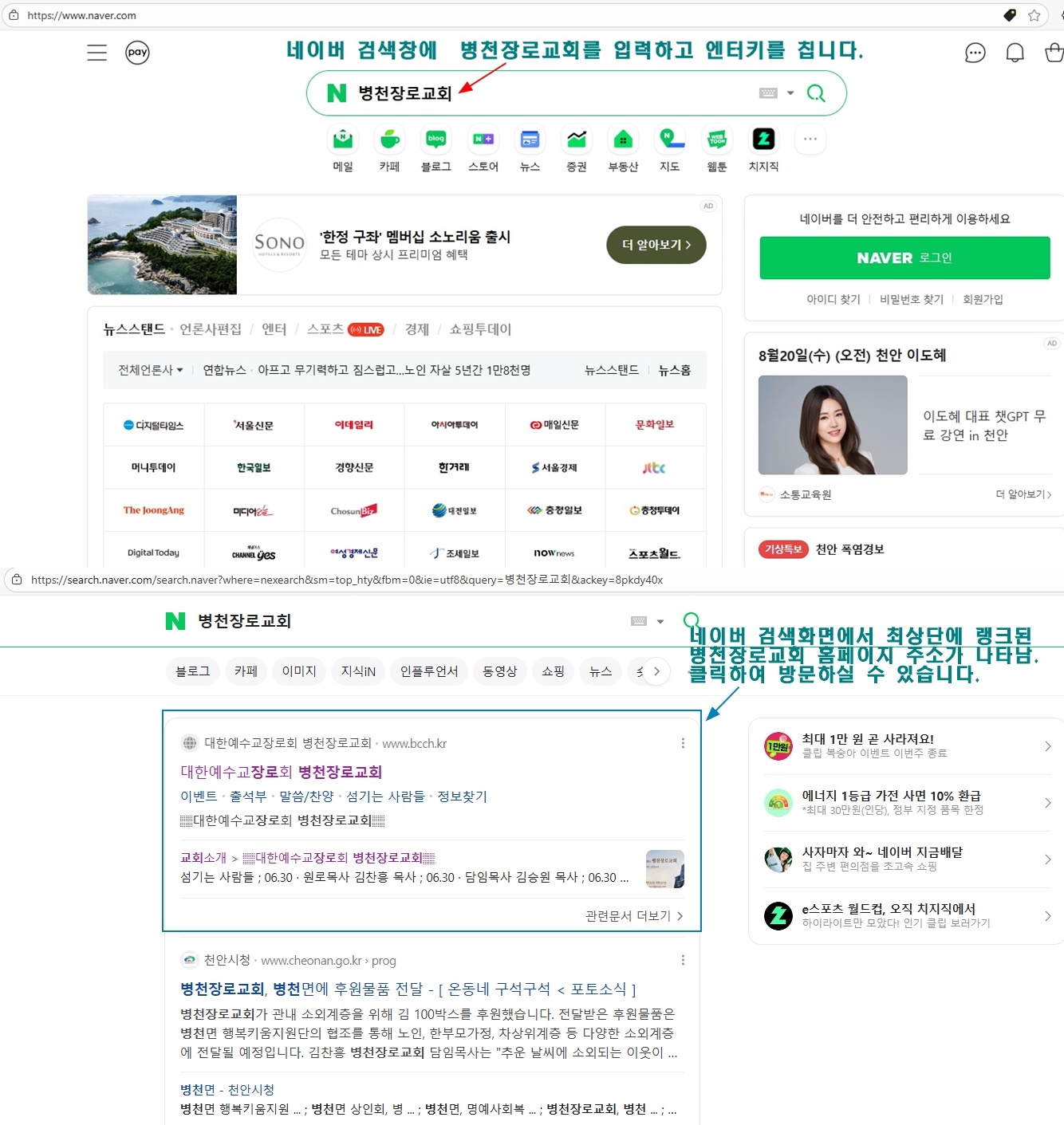 네이버 검색에서 저희 병천장로교회를 검색하는 방법입니다. 관리자 0 2151 2025.08.03 08:55 샬롬! 네이버 검색에서 저희 병천장로교회를 검색하는 방법입니다. 1. 네이버에 접속합니다. 2. 네이버 검색창에 병천장로교회를 입력 후 엔터키를 누릅니다. 3. 네이버 검색화면에서 최상단에 랭크된 병천장로교회 홈페이지 주소가 나타나고, 이를 클릭하면 교회 홈페이지에 방문하실 수 있습니다. *오늘도 주님안에서 승리하시기를 기도드립니다. Author 1 1 Lv.77 관리자 최고관리자 367,730 (78.2%) 너희 안에 이 마음을 품으라 곧 그리스도 예수의 마음이니(빌립보서 2:5) Let this mind be in you, which was also in Christ Jesus(Philippians 2:5)