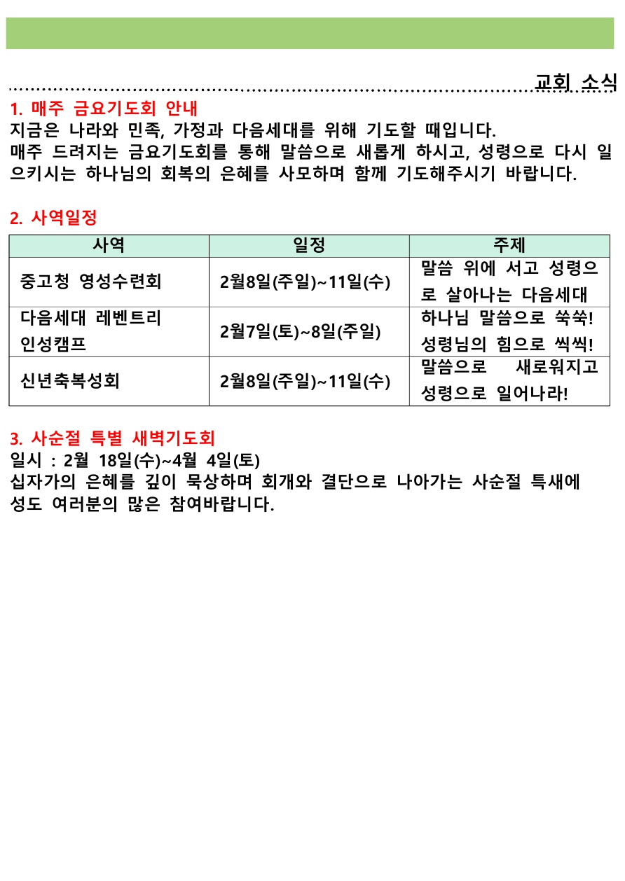 교회소식 (2026년 2월 1일 주일) 관리자 0 455 02.01 18:54 Author 1 1 Lv.77 관리자 최고관리자 367,730 (78.2%) 너희 안에 이 마음을 품으라 곧 그리스도 예수의 마음이니(빌립보서 2:5) Let this mind be in you, which was also in Christ Jesus(Philippians 2:5)