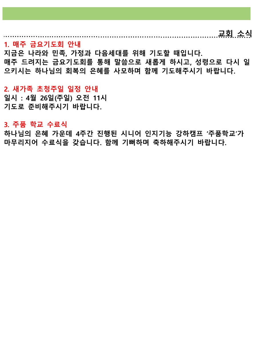 교회소식 (2026년 4월 5일 주일) 관리자 0 6 9시간전 Author 1 1 Lv.77 관리자 최고관리자 368,730 (89.8%) 너희 안에 이 마음을 품으라 곧 그리스도 예수의 마음이니(빌립보서 2:5) Let this mind be in you, which was also in Christ Jesus(Philippians 2:5)
