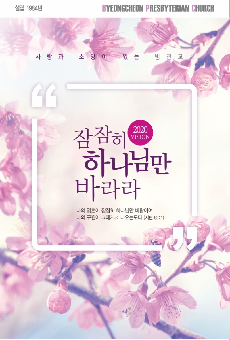 2020년 병천장로교회 교회표어 병천교회 기타 0 5537 2022.06.10 08:22 Author 1 1 Lv.77 관리자 최고관리자 368,380 (85.8%) 너희 안에 이 마음을 품으라 곧 그리스도 예수의 마음이니(빌립보서 2:5) Let this mind be in you, which was also in Christ Jesus(Philippians 2:5)