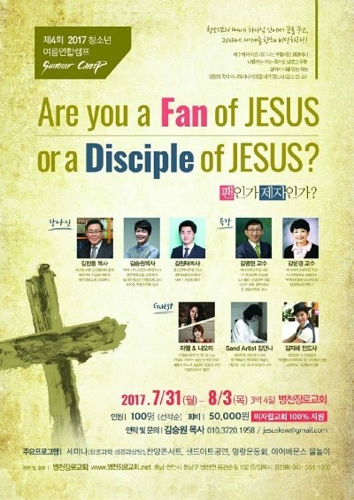예수님의 팬인가? 제자인가? 병천교회 수련회 0 6475 2022.06.13 11:33 Author 1 1 Lv.77 관리자 최고관리자 368,380 (85.8%) 너희 안에 이 마음을 품으라 곧 그리스도 예수의 마음이니(빌립보서 2:5) Let this mind be in you, which was also in Christ Jesus(Philippians 2:5)
