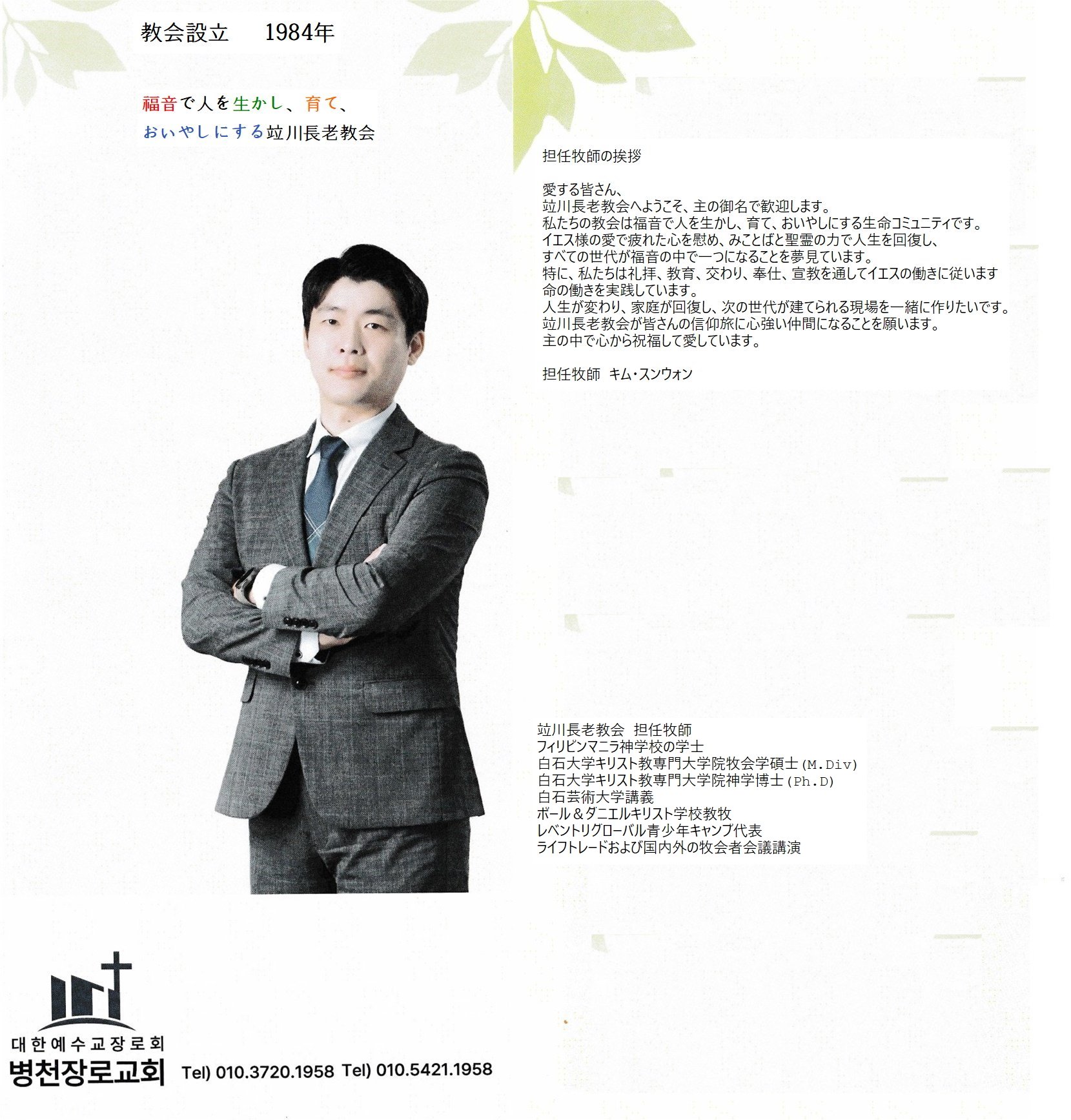 교회 소개 리플렛(일문-日文 Japanese) 관리자 공지 0 1430 2025.08.15 19:54 Author 1 1 Lv.77 관리자 최고관리자 368,330 (85.2%) 너희 안에 이 마음을 품으라 곧 그리스도 예수의 마음이니(빌립보서 2:5) Let this mind be in you, which was also in Christ Jesus(Philippians 2:5)