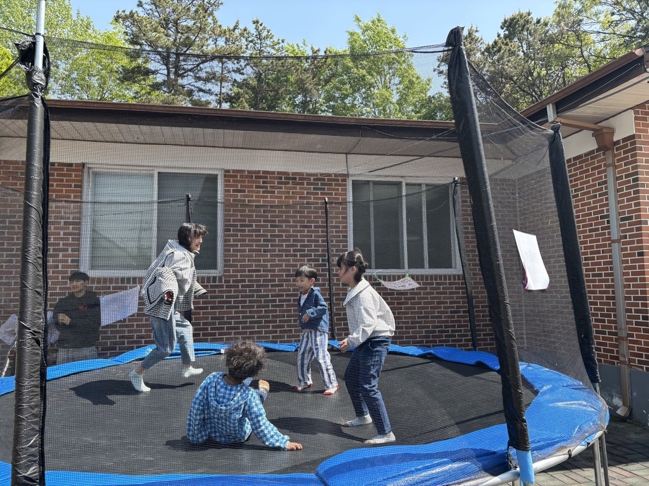 어린이 대잔치 행사에서 트램폴린에서 즐거운 시간을 보내는 주일학교 어린이들
