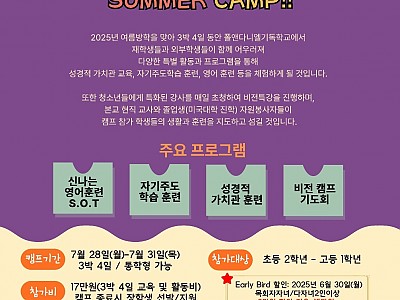 폴앤다니엘기독학교 SUMMER CAMP!! ★ 대상: 초등 2학년 ~ 고등 3학년 ★기간: 7월 28일(월) ~ 7월 31일(목) / 3박 4일 ★장소: 폴앤다니엘기독학교 (아산시…