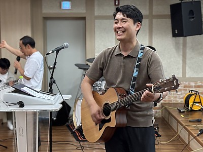 2025년 전교인 수련회 : 6월 6일(금)~6월 7일(토) - 광은기도원 ⑤ 기타치시는 담임목사님! 성도님들의 얼굴이 해같이 빛나네요.함께 마음 나누어 주신 우리 교회 성도님들 …