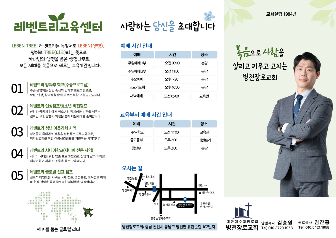 교회 소개 리플렛 ① 관리자 공지 0 9300 2025.07.21 11:32 Author 1 1 Lv.77 관리자 최고관리자 367,730 (78.2%) 너희 안에 이 마음을 품으라 곧 그리스도 예수의 마음이니(빌립보서 2:5) Let this mind be in you, which was also in Christ Jesus(Philippians 2:5)
