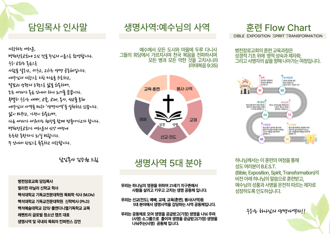 교회 소개 리플렛 ② 관리자 공지 0 9216 2025.07.21 11:34 Author 1 1 Lv.77 관리자 최고관리자 367,730 (78.2%) 너희 안에 이 마음을 품으라 곧 그리스도 예수의 마음이니(빌립보서 2:5) Let this mind be in you, which was also in Christ Jesus(Philippians 2:5)
