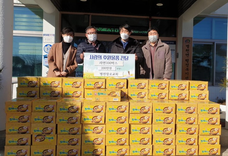 천안시 병천장로교회(담임목사 김승원)가 16일 병천면행정복지센터를 방문해 라면 100박스를 전달했다.