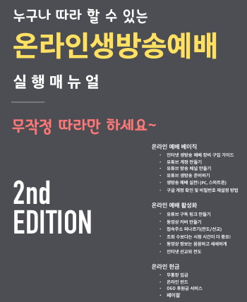 누구나 따라할 수 있는 온라인예배 실행매뉴얼 2nd Edition - 생방송 예배 실전 테크닉 - PDF파일 본으로 다운받으신 후 인쇄하셔서 사용하시기 바랍니다.